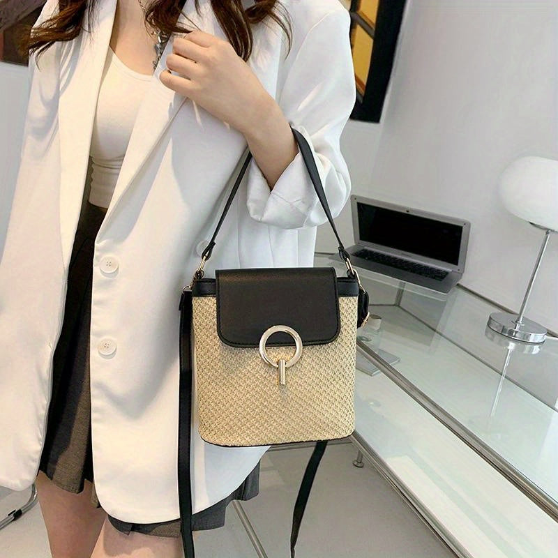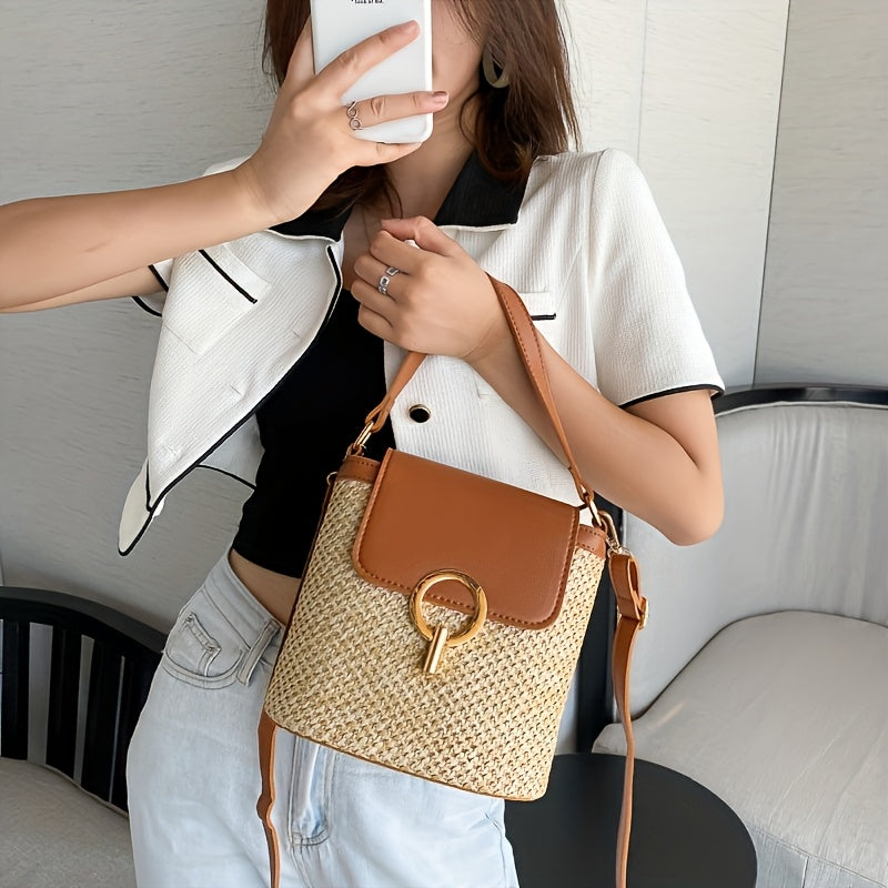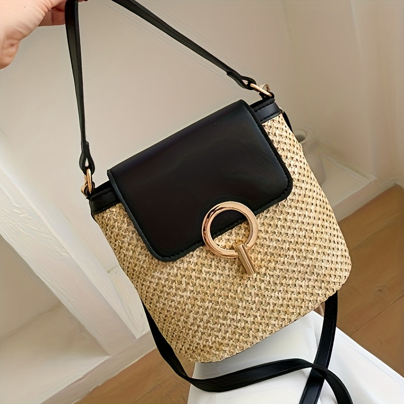 Ce sac à main chic allie le charme naturel de la paille à un look moderne et élégant. Le sac a un design sophistiqué avec une fermeture sécurisée et un anneau doré distinctif qui crée un look luxueux et sophistiqué. Qu'il s'agisse d'une journée décontractée ou d'une occasion spéciale, ce sac ajoutera une touche de classe à votre look.